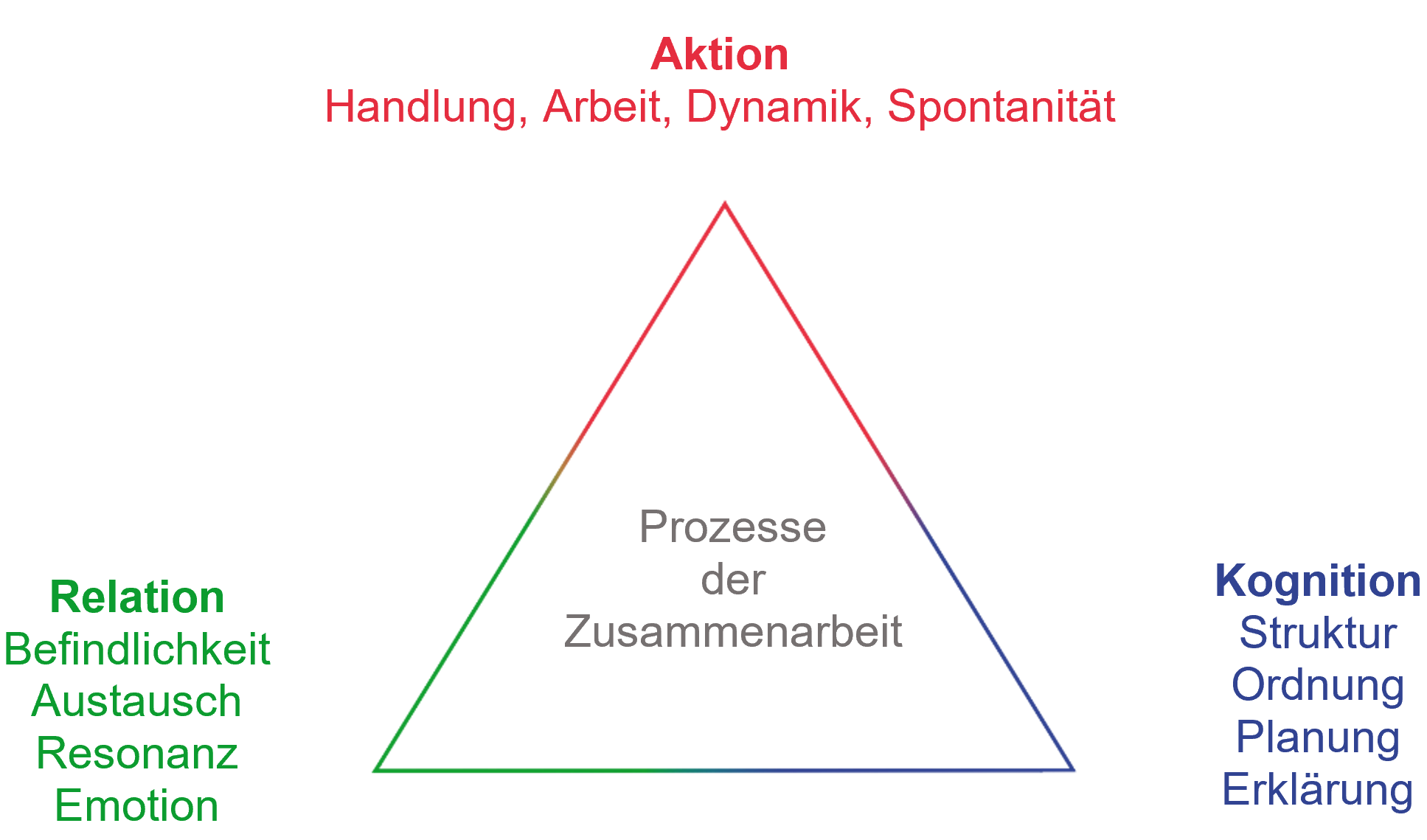 Werden Zusammenarbeits-Prozesse näher betrachtet können darin drei grundlegende Dimensionen entdeckt werden. Die Aktion beschreibt die Umsetzung und die Handlungen. In der Kognition finden die Planung und Strukturierung statt. Während die Relation den Bezug zu allen Beteiligten und den Austausch beinhaltet.